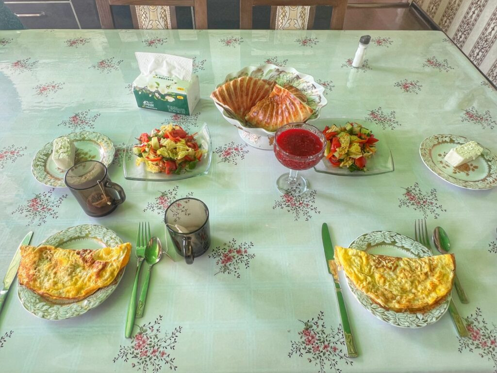 …where we’d be served our complimentary best and biggest breakfasts in the Stan’s thus far…an omelet, cheese, veggie salad, bread/jam and tea. So delightful! This guesthouse was such a great value we decided to return after our trip to Song Kul.