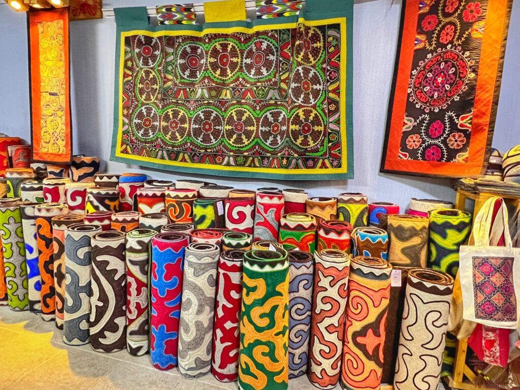 While there we visited an NGO Women made artisan souvenir shop next to CBT Kochkor. It was bursting with colorful products, which we’d love to snap up…if we had a place to put them. These included vibrant walls loaded with handmade rugs, which are actually often used for construction on the inside of yurts.