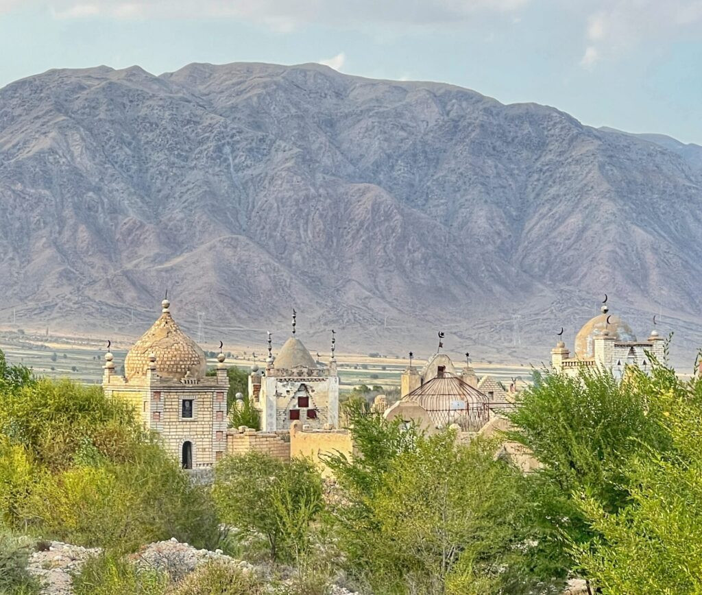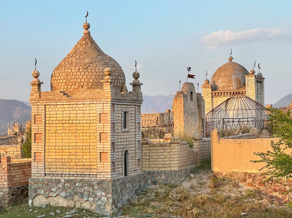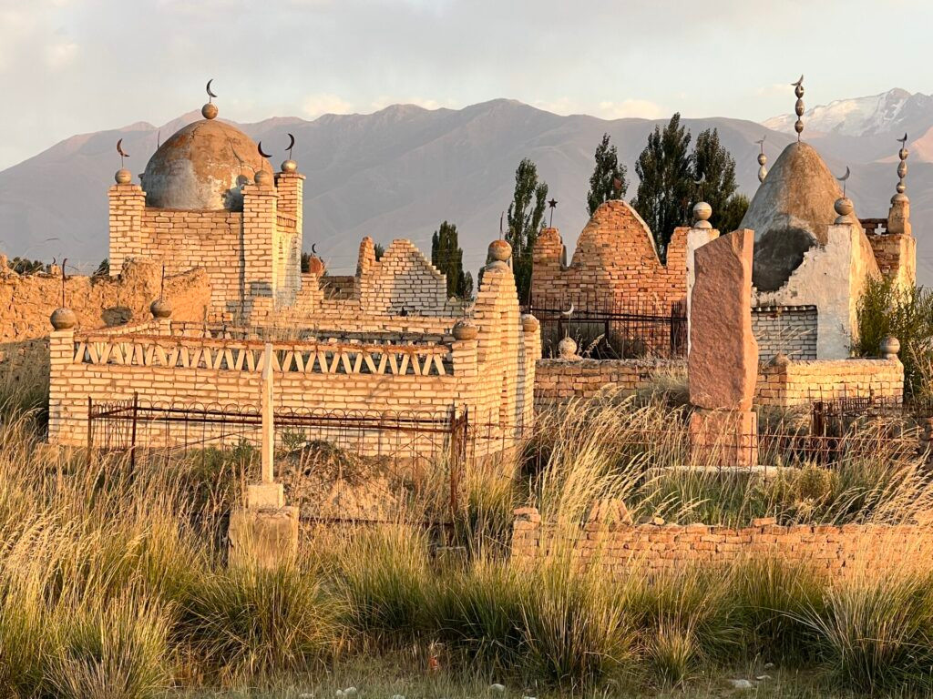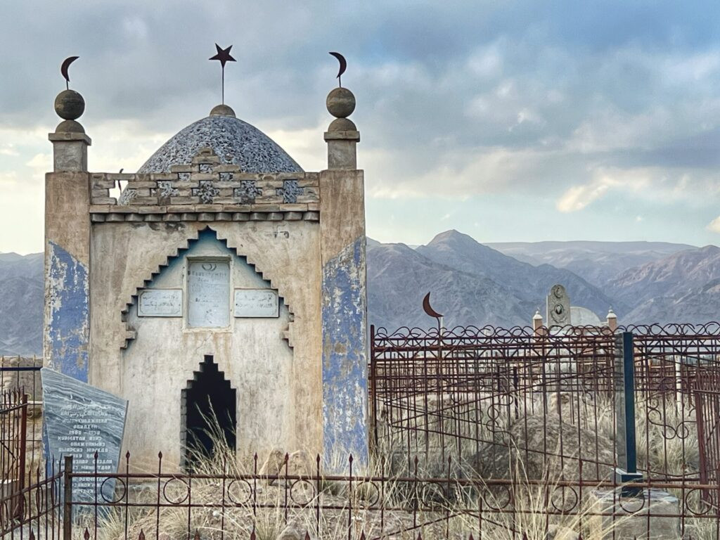 This historic Muslim cemetery has a striking mix of local styles, which blend Kyrgyz, Islam and Soviet influence in one place….not surprising given its place as a nomadic crossroads. Some tombs magnificently resemble monuments like the Taj Mahal, some adobe mausolea with domes/turrets, some Soviet-era black granite portrait headstones, and a plethora of Islamic crescents.
