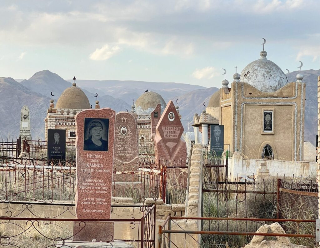 Others reflect Kyrgyz nomadic heritage with caged yurts dropped over tombstones.