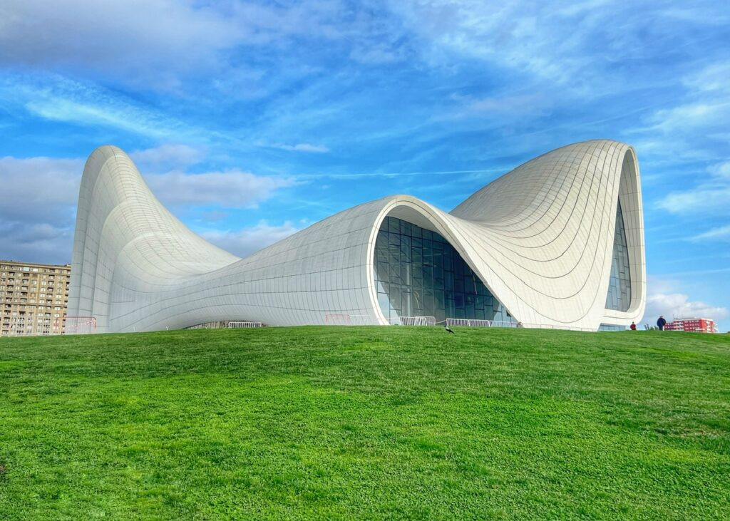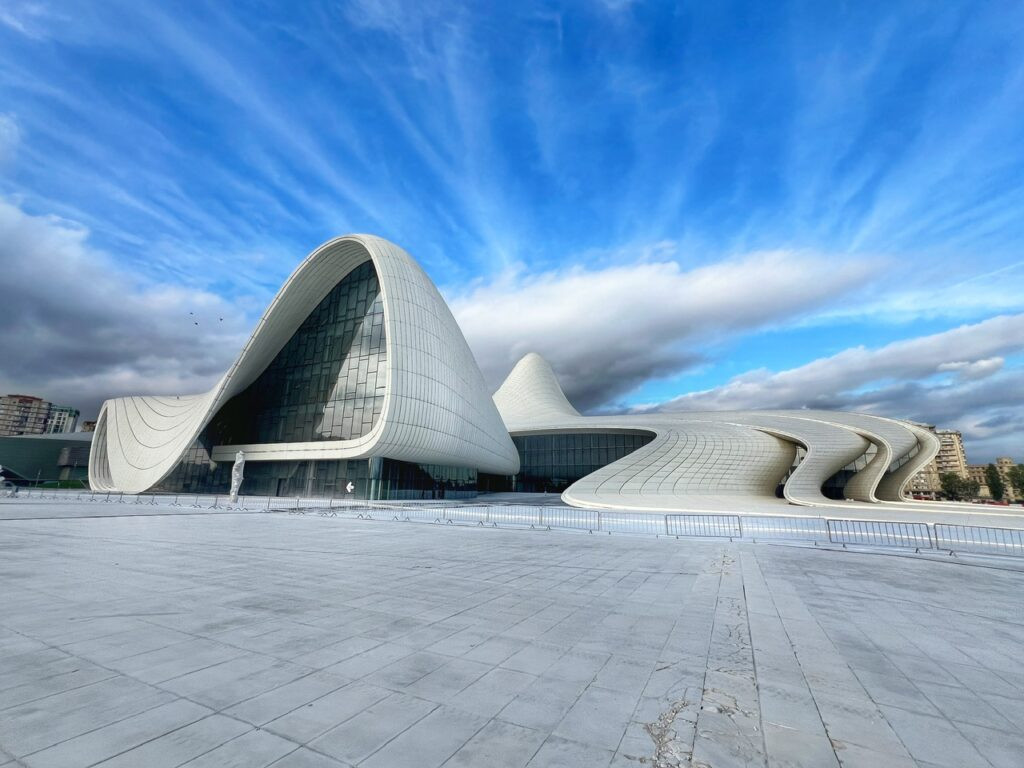 Against a sky which was dancing with movement in the continuous Baku breeze, its futuristic mold seems to dance along with it. Its white exterior is made of reinforced concrete and glass fiber panels which gives it an almost organic feel — like a swath of fabric caught paused in motion.