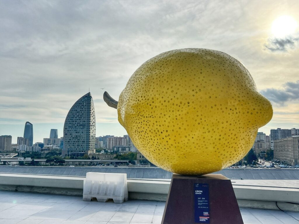Also, we found a cheerfully unexpected massive lemon, which is apparently the work Philip Haas, an American sculptor known for his monumental fruit and vegetable heads. It’s not meant to be political, but a playful contrast to the stark modernism of the building. The bright yellow, organic shape pops vividly against the smooth white curves of the Center, creating a whimsical, almost surreal effect.