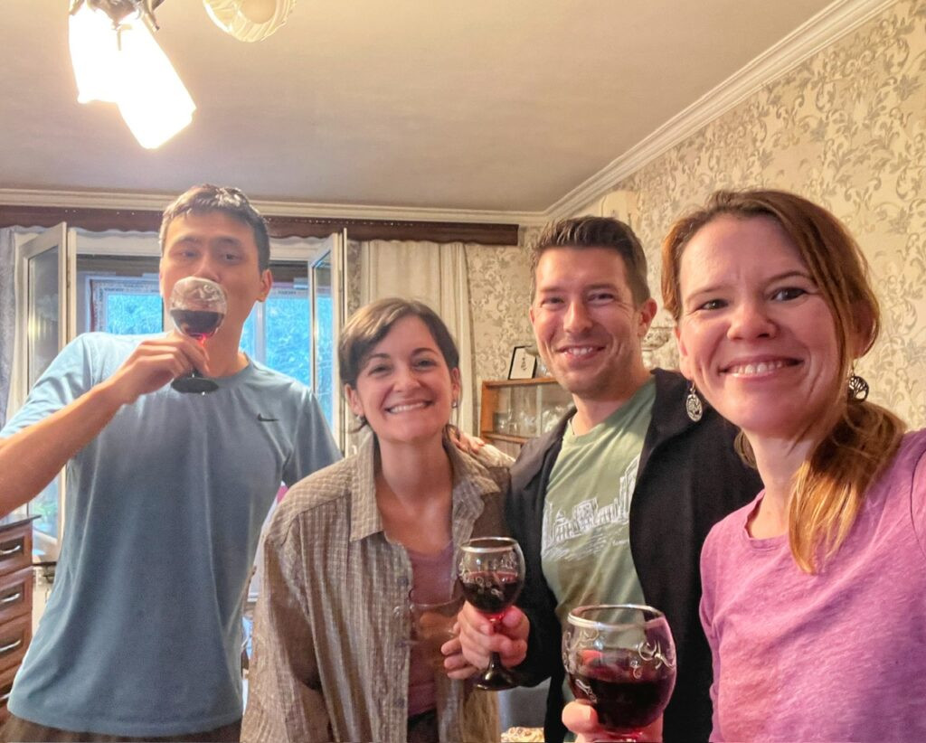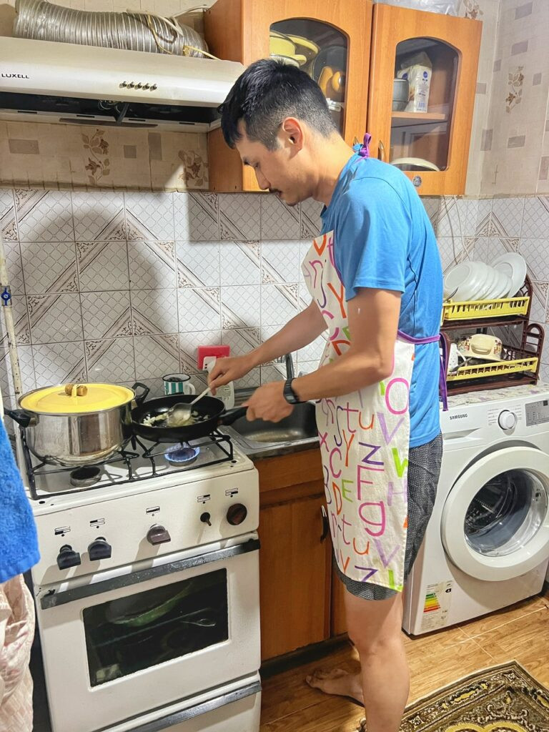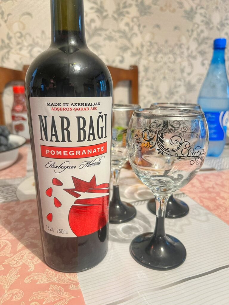 We also had the joy of meeting up with our Pamir Highway pals, Canadians Annabelle and Yi, one last time because we had a crossover day. They invited us to their extraordinarily Soviet grandma-style apartment for dinner and pomegranate wine, which practically flows from the fountains in Azerbaijan. It was too sweet for us, so we only had this one bottle, but it was still fun to try. We also enjoyed watching Yi whipping up our dinner, donning his matronly apron.