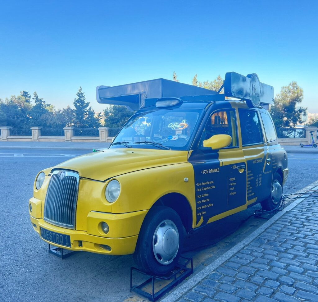 Retro cars outfitted as coffee shops. It seemed that anything trendy was always displayed in English.
