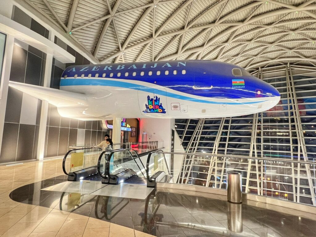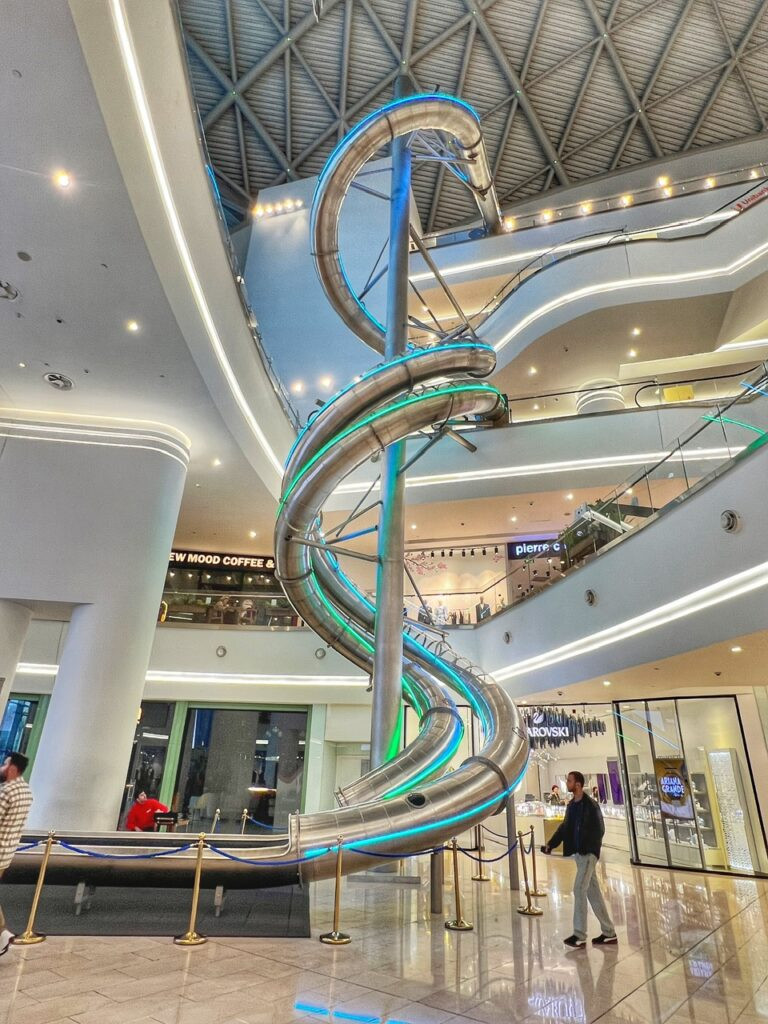 With the expansion of online shopping and our general disinterest in the activity, it’s not often we spend an evening at the shopping mall these days…particularly one in the shape of a lotus. But this mall is far from just a monotonous line of unenticing retailers. It’s an adventure featuring a trampoline wonderland, a giant Kids Park accessorized by the front of a real Azerbaijan Airlines jet, and the one thing we could take advantage of as adults…the four-story super slide!