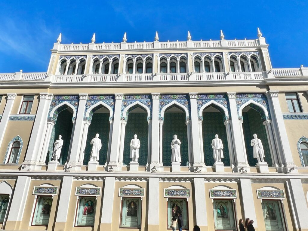 The Nizami Museum of Azerbaijani Literature, which features more than 120,000 items. Since we don’t read Azerbaijani, nor do we want to try, we opted to just check out the façade of the museum, which has striking blue majolica tiles, and statues of six major Azerbaijani literary figures.