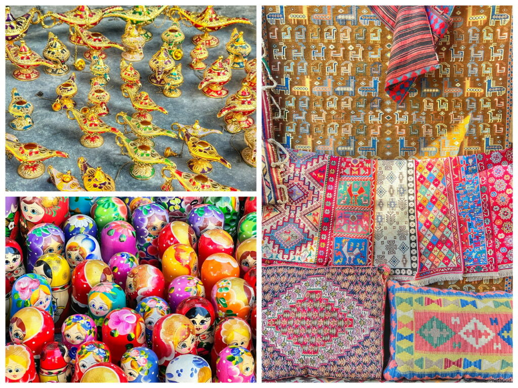 The melting pot of this region can be captured in its souvenirs impeccably. It’s the first place we’ve seen Persian rugs….next to Arabian Aladdin-style lamps… next to colorful Russian nesting dolls. Speaking of Aladdin…get your flying carpets here!!