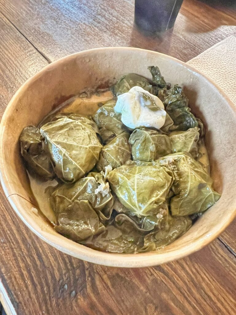 They were stuffed with minced beef, rice, onions, turmeric and other herbs all wrapped in tender grape leaves and topped with a garlic infused yogurt. Quite tasty.